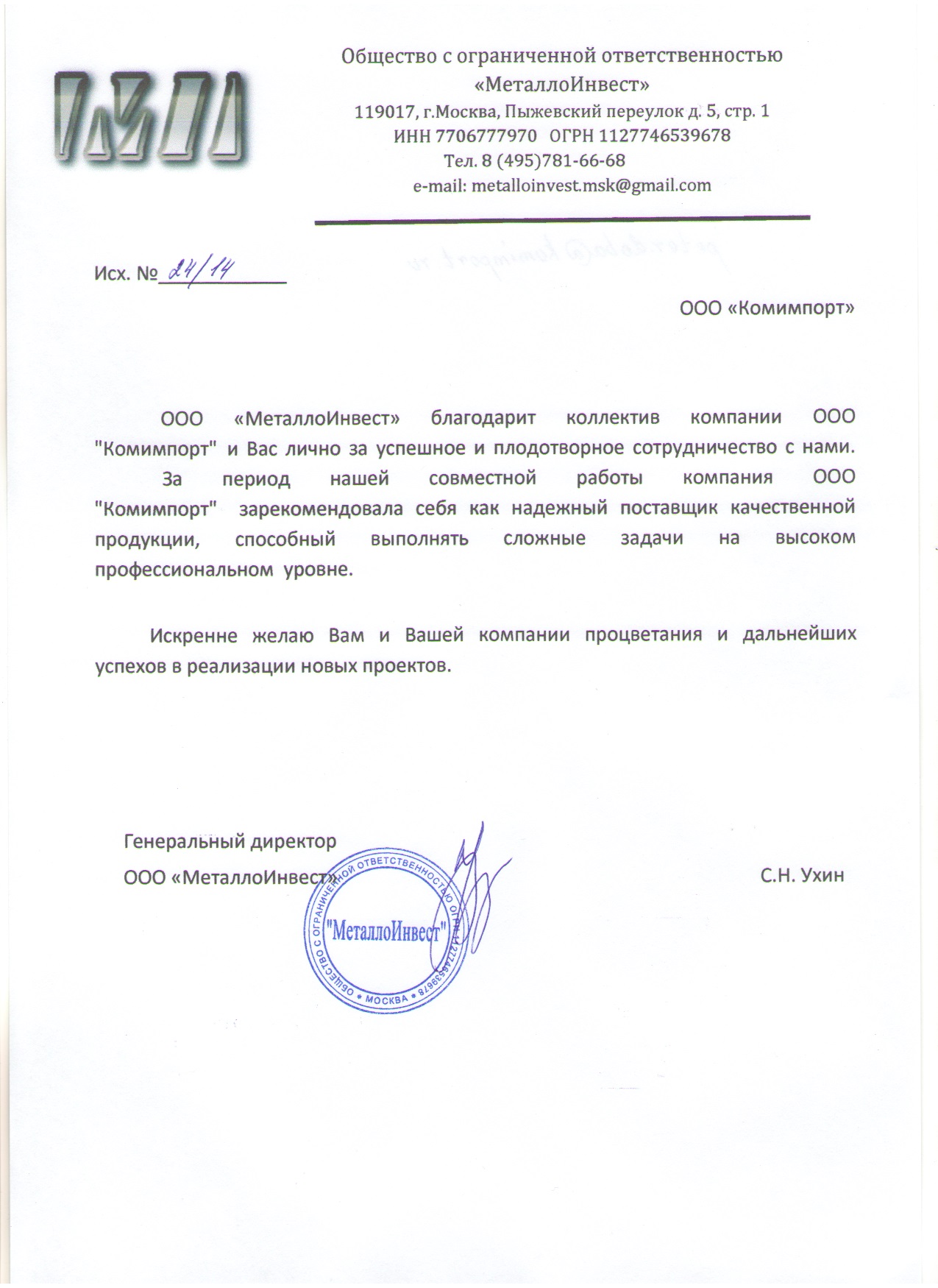 ООО «МеталлоИнвест» благодарит коллектив компании ООО «Комимпорт» и Вас лично за успешное и плодотворное сотрудничество с нами. За период нашей совместной работы компания ООО «Комимпорт» зарекомендовала себя как надежный поставщик качественной продукции способный выполнять сложные задачи на высоком профессиональном уровне. Искренне желаю Вам и Вашей компании процветания и дальнейших успехов в реализации новых проектов.