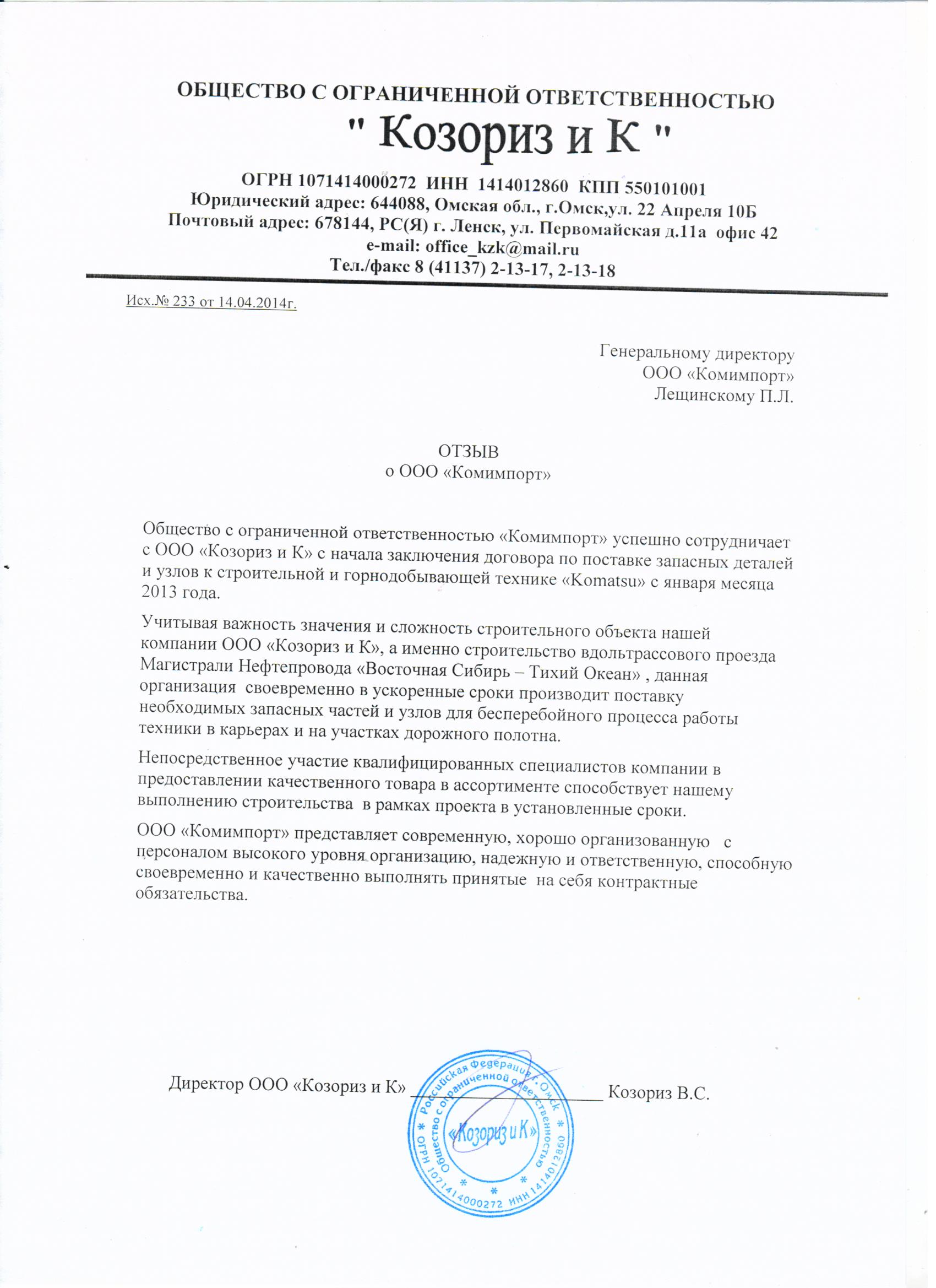 Общество с ограниченной ответственностью «Комимпорт» успешно сотрудничает с ООО «Козориз и К» с начала заключения договора о поставке запасных деталей и узлов к строительной и горнодобывающей технике «Komatsu» с января 2013 года. Учитывая важность значения и сложность строительного объекта нашей компании ООО «Козориз и К», а именно строительство вдольтрассового проезда Магистрали Нефтепровода «Восточная Сибирь – Тихий Океан», данная организация своевременно в установленные сроки производит поставку необходимых запасных частей и узлов для бесперебойного процесса работы техники в карьерах и на участках дорожного полотна. Непосредственное участие квалифицированных специалистов компании в предоставлении качественного товара в ассортименте способствует нашему выполнению строительства в рамках проекта в установленные сроки. ООО «Комимпорт» представляет современную, хорошо организованную с персоналом высокого уровня организацию, надежную и ответственную, способную своевременно и качественно выполнять принятые на себя контрактные обязательства.